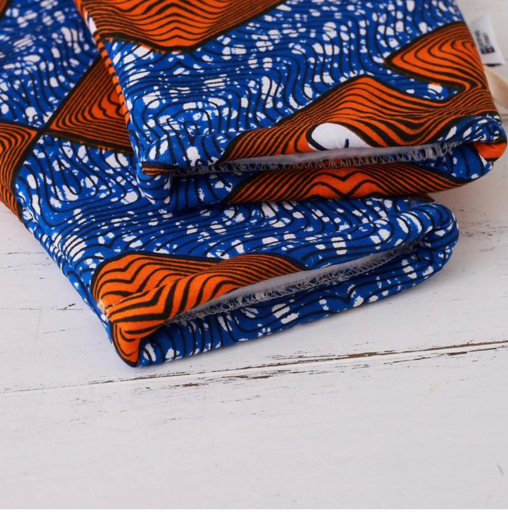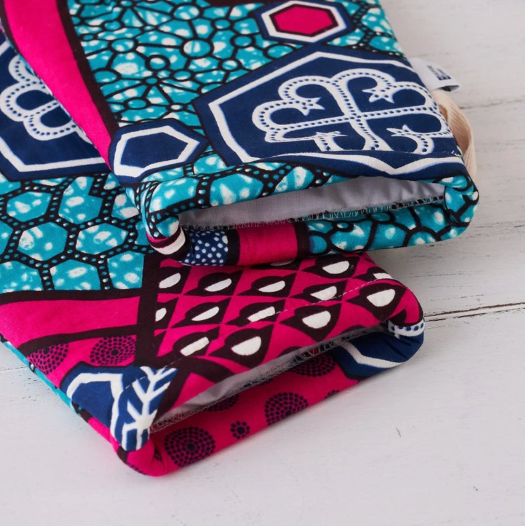 Featuring a colorful abstract African print, these oven mitts are made from African print, lined inside with plain cotton and filled with specifically formulated insulated heat resistant wadding to reflect heat away from your hands and back towards the hot item you are handling. The wadding inside these gloves is specified to meet British Safety standard oven glove insulation.